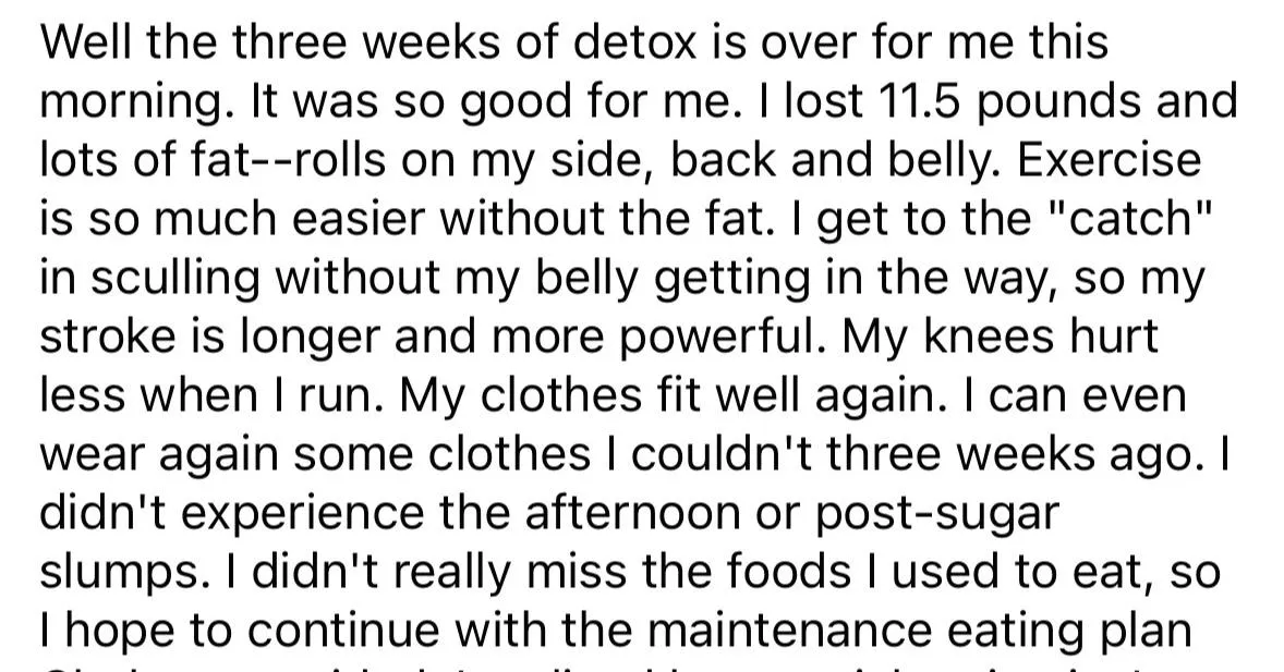 65 year old female, after her detox protocol and weight plateau at 165 lbs, lost 11 lbs after detox